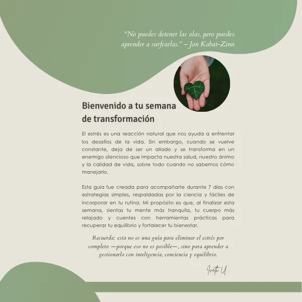Este libro es una invitación a detenerte, respirar profundo y comenzar un proceso de transformación en tan solo 7 días. Transforma tu estrés a través de técnicas naturales, ejercicios simples y estrategias fáciles de aplicar. Además, aprenderás a reconocer el impacto del estrés en tu vida y a gestionarlo con conciencia.