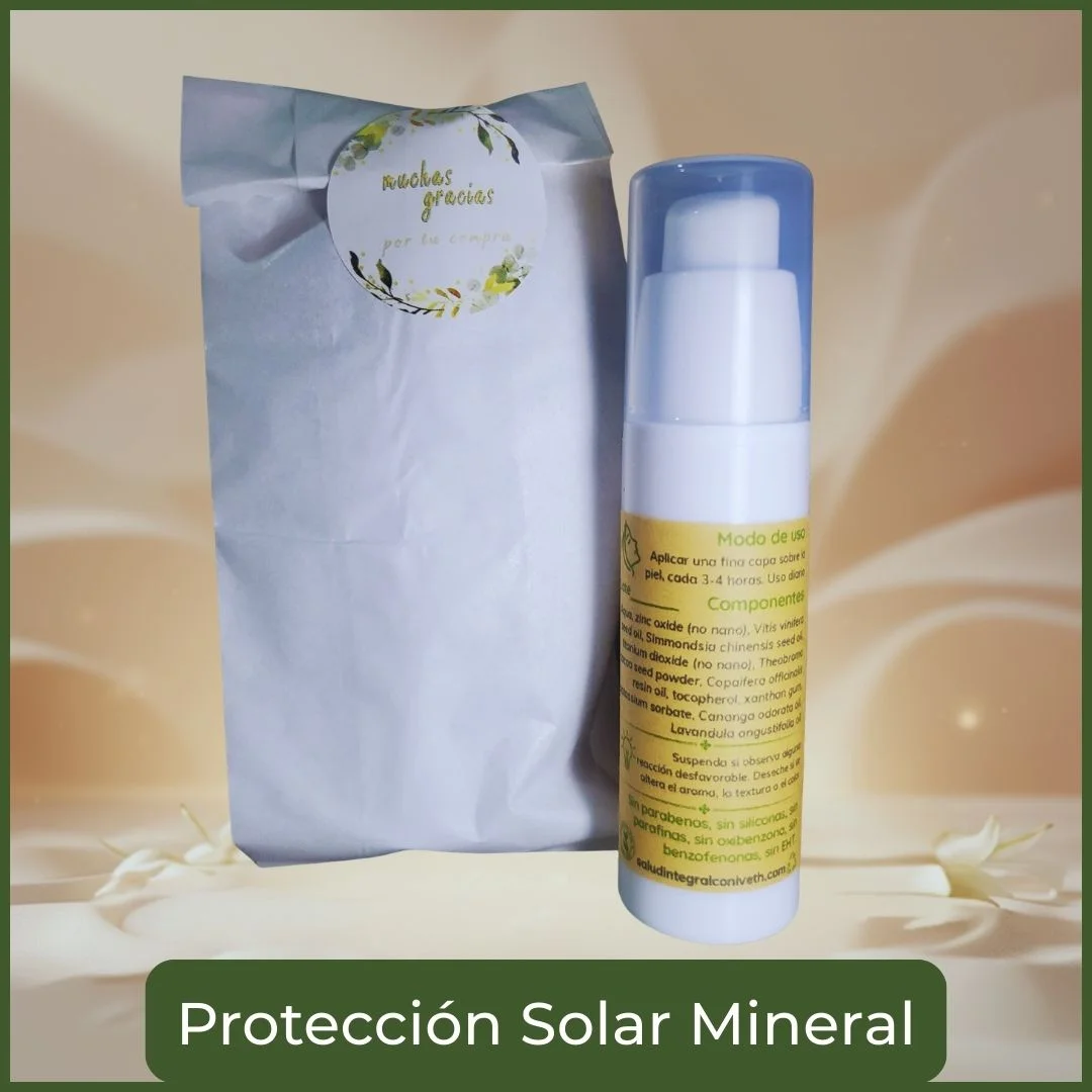 Este protector solar mineral está formulado con ingredientes puros que cuidan tu piel mientras la protegen de la radiación UVA y UVB. Es una preparación artesanal, creada con aceites vegetales de alta calidad y filtros minerales naturales que actúan como barrera física, ideal para pieles sensibles, reactivas o que buscan evitar filtros químicos como las benzofenonas.